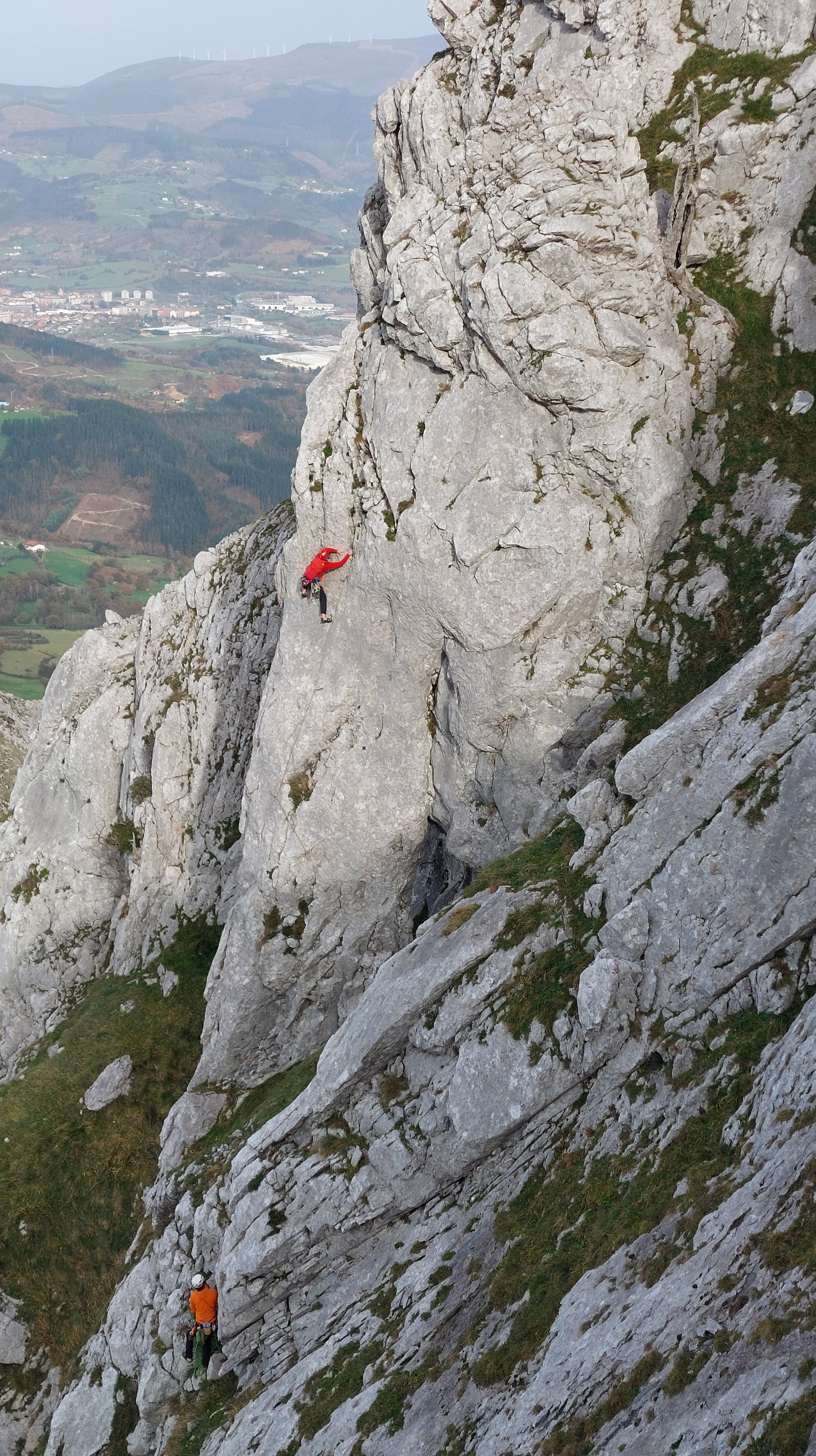 Largo 1 , IV (55 metros): Una placa tumbada llena de pequeñas lajas típicas de Atxarte nos lleva a la placa final que se ve aprecia desde pie de vía con un paso de V+ (buen agarre y pie en adherencia). A medida que escalamos nos dejamos guiar por la multitud de cordinos que vamos encontrando sobre puentes de roca.