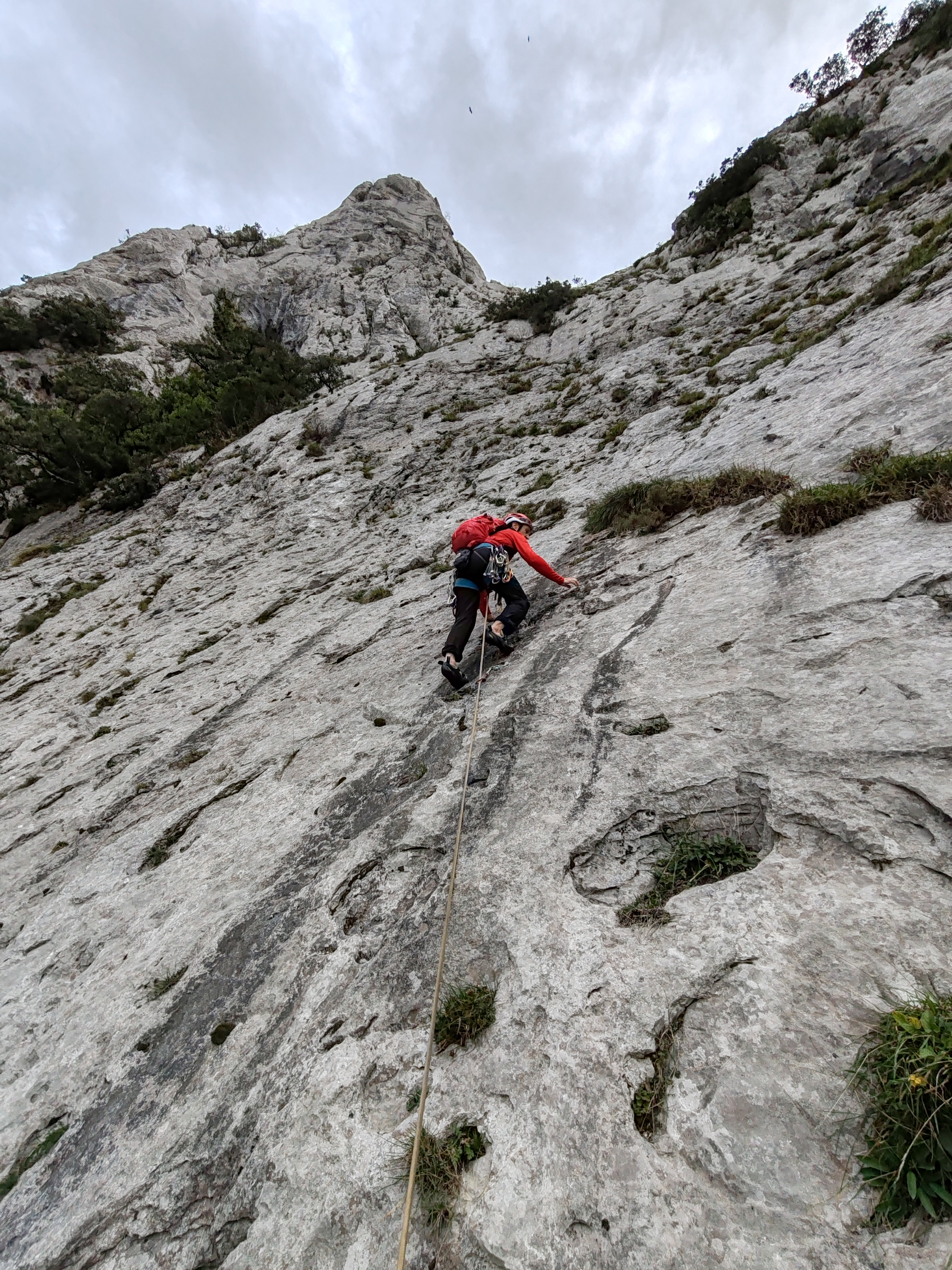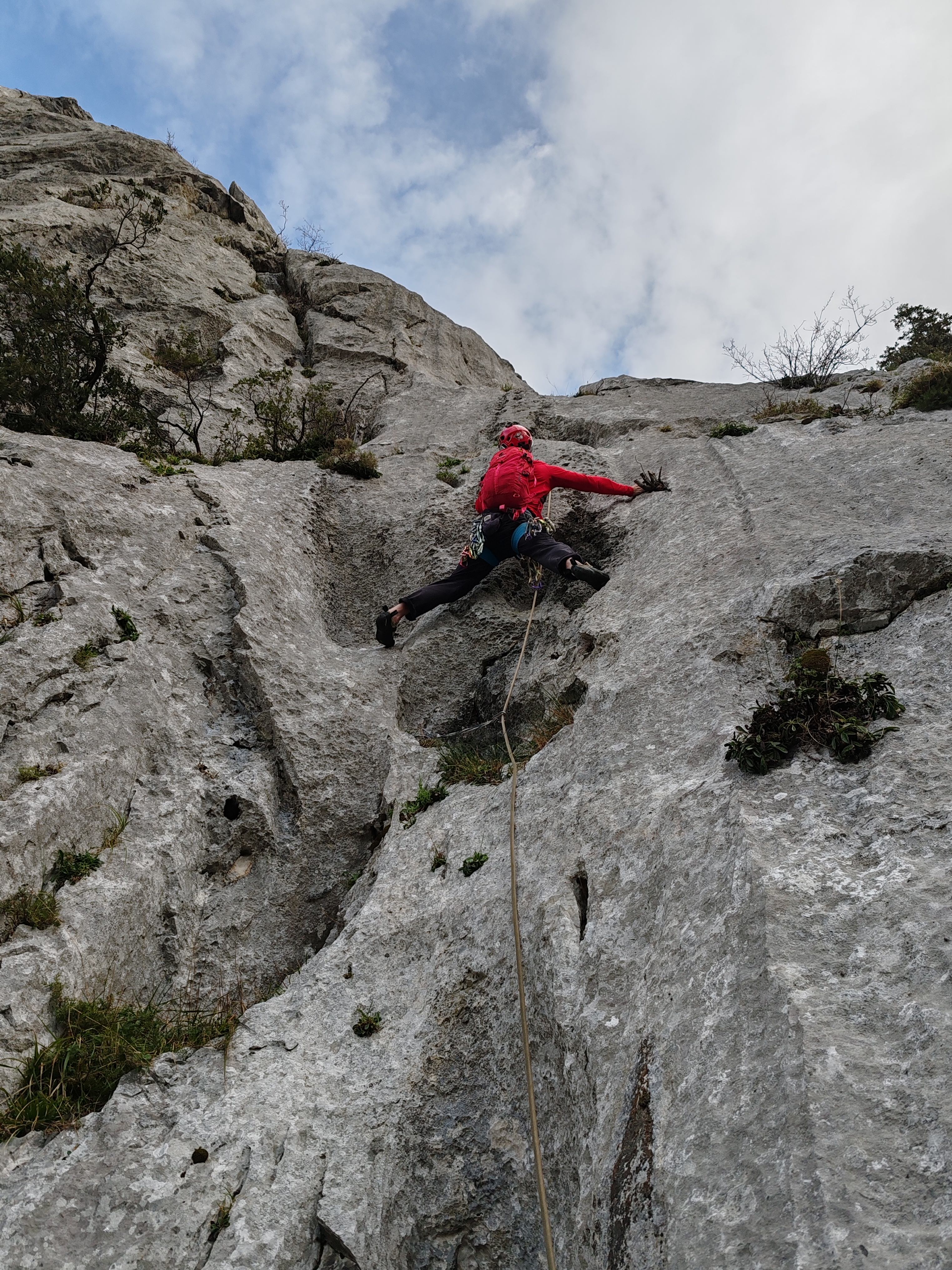 Largo 8 , V+ (40 metros):Este largo nos pareció buenísimo. Primero una placa con regletas y después de una pequeña vira herbosa otra placa, esta vez de pequeñas baldas y resaltes en forma de tacos. De navegar e ir tranquilo.