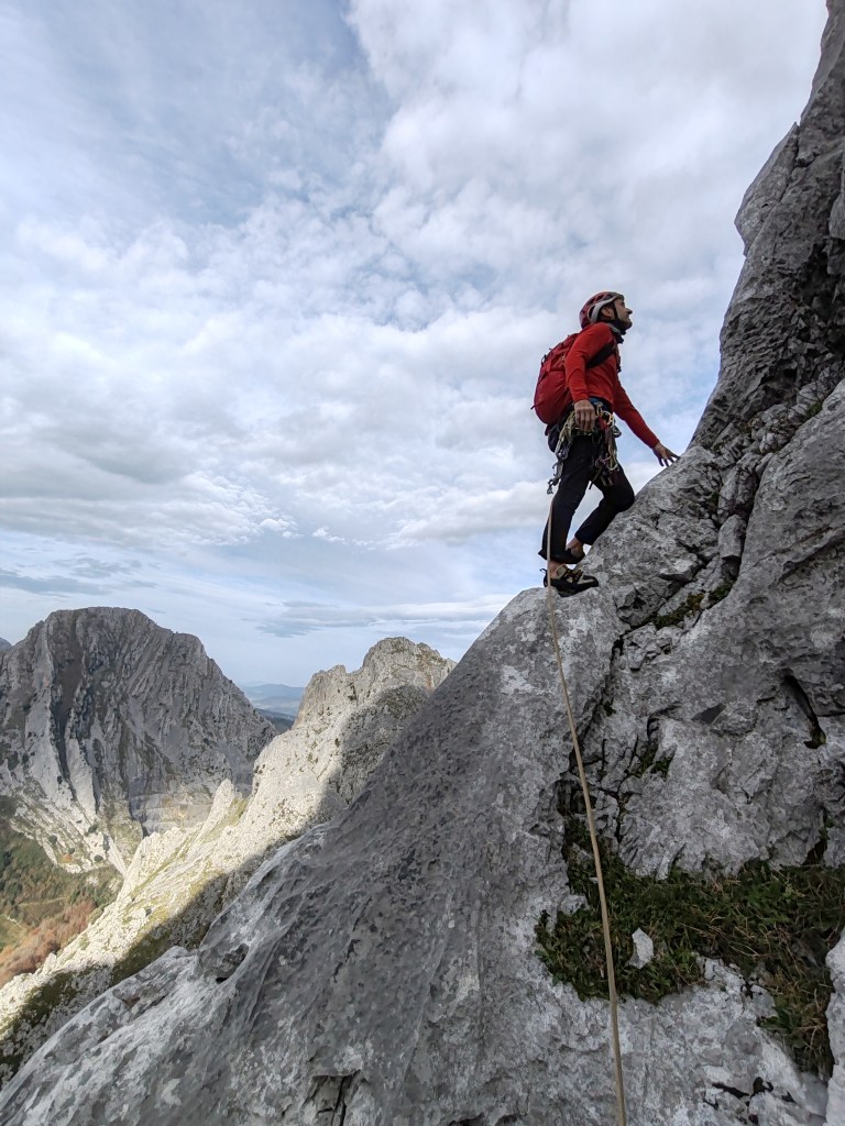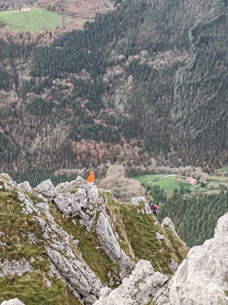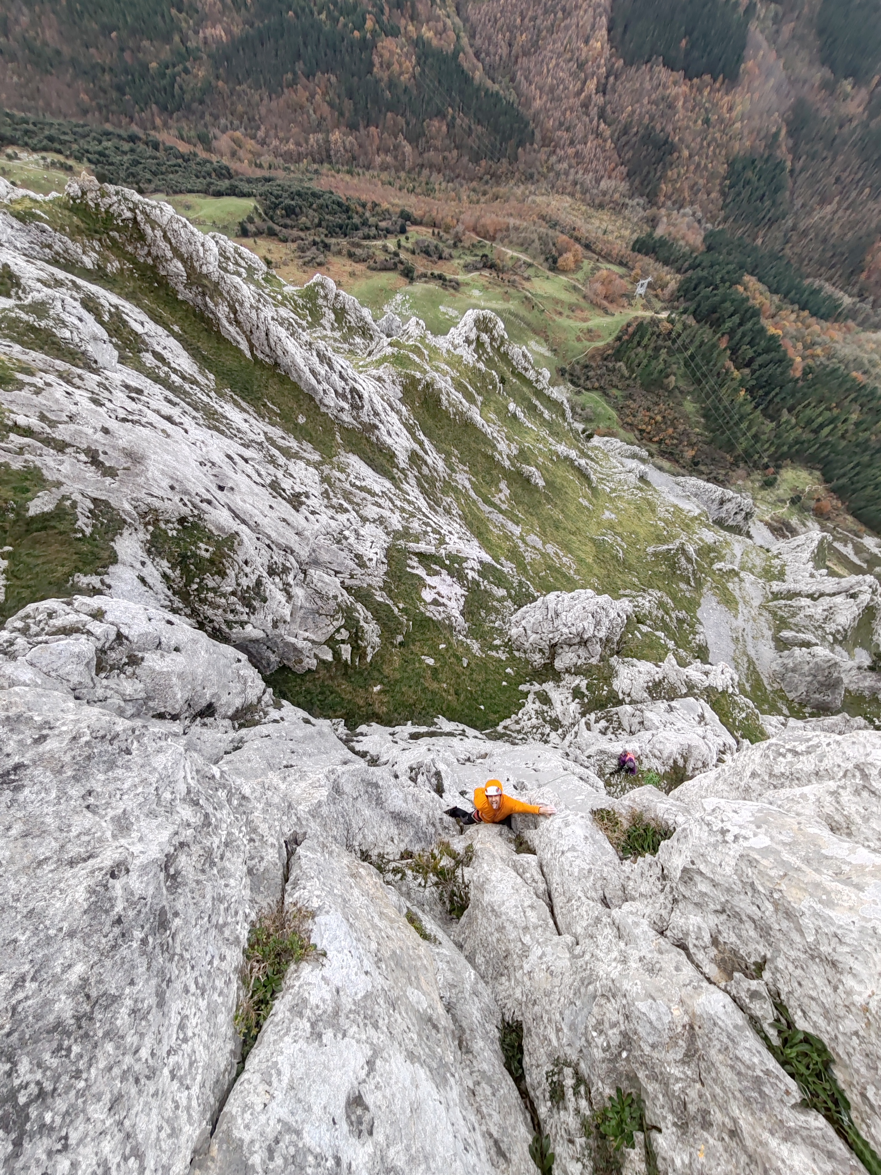 Largo 5 , IV (40 metros): Una vez más la dificultad la encontraremos al salir de la reunión. Salimos hacia la izquierda con unas bonitas vistas sobre el Untzillaitz. Un pasito en la fisura y seguimos la arista hasta un colladito donde montamos reunión (sobre friends). Ojo a la arista que hay mucha roca rota.