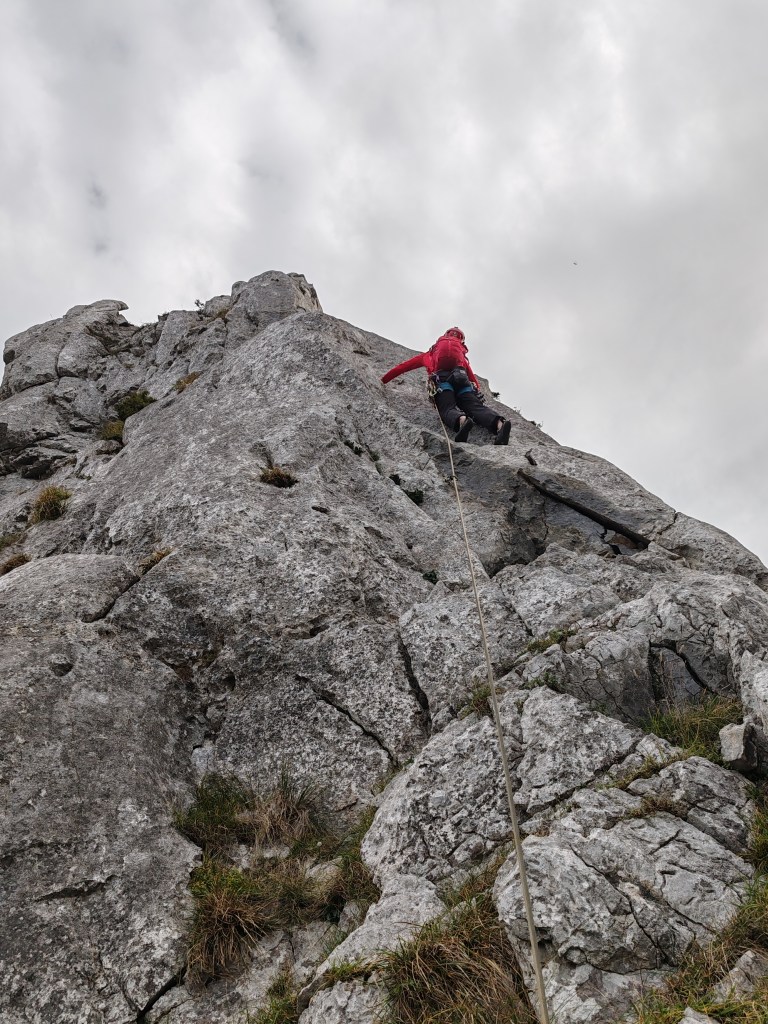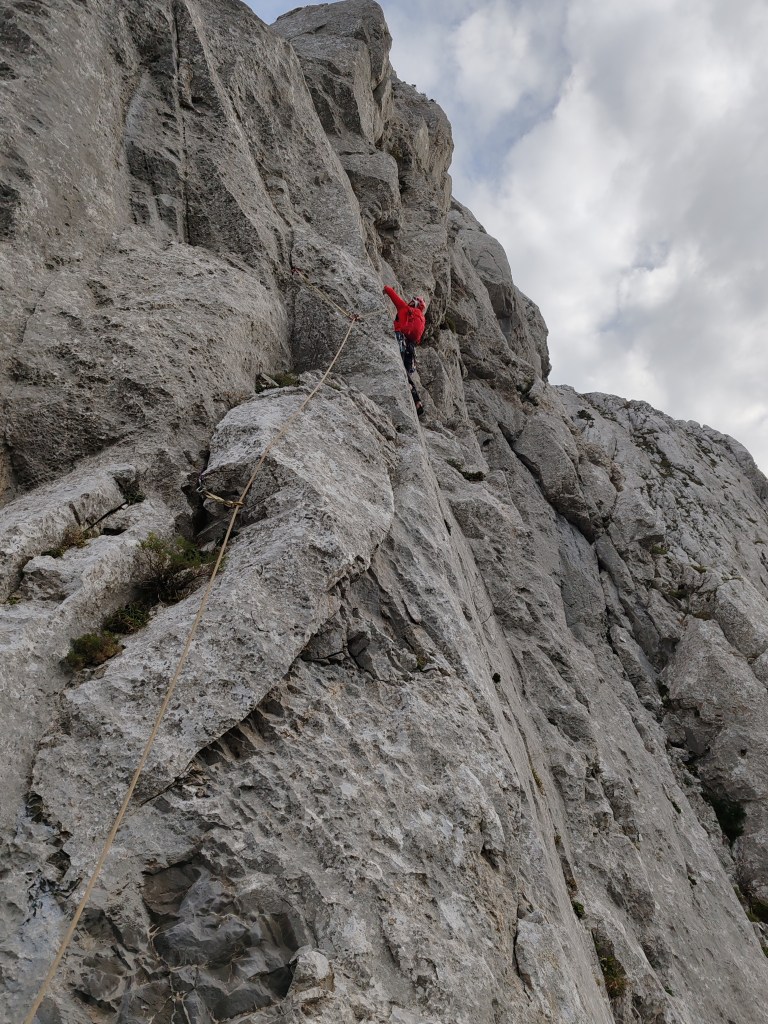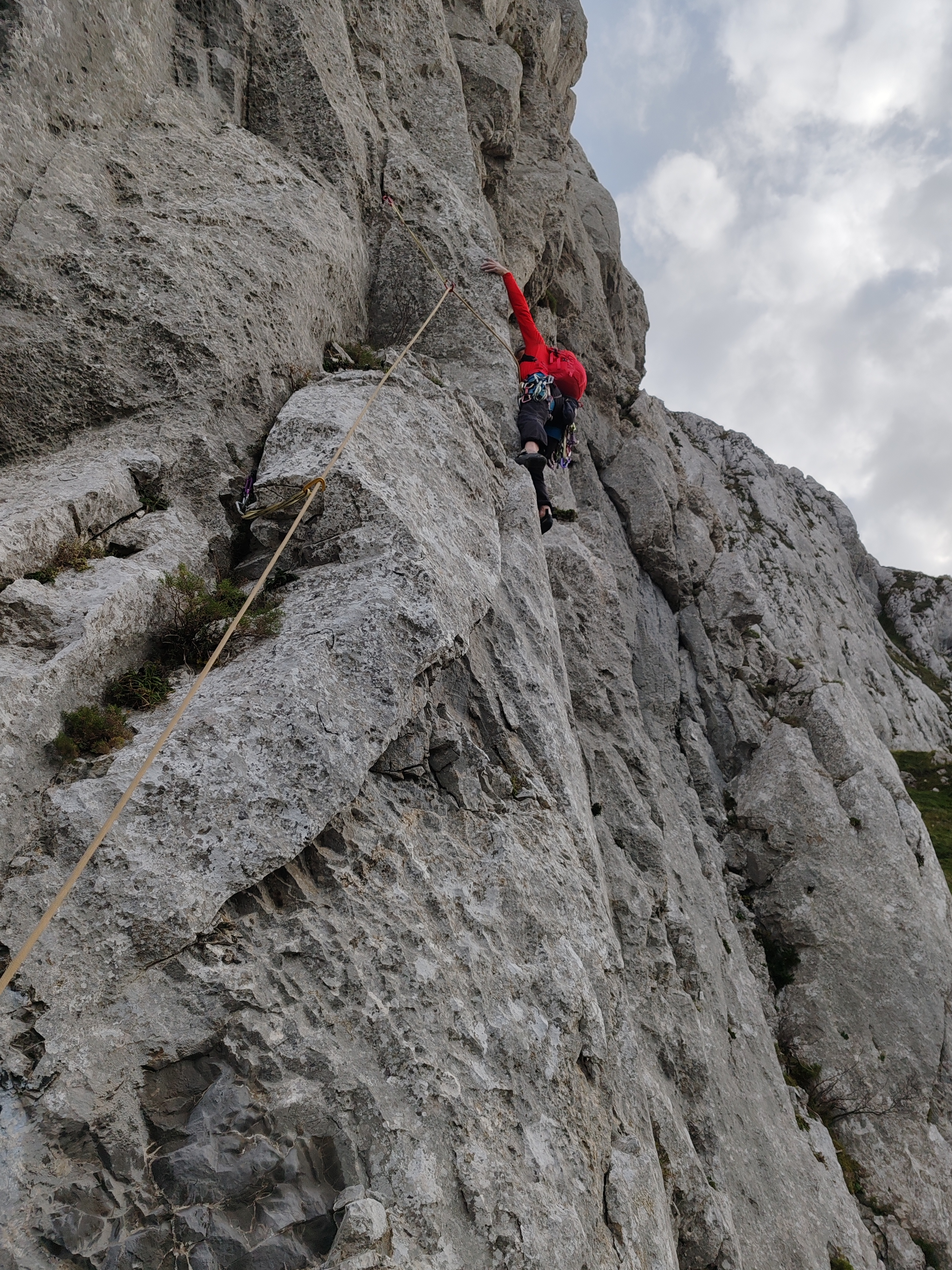 Largo 4 , IV (60 metros): La única dificultad del largo está al salir de la reunión a la derecha, para montarnos en una bañera de caliza compacta y después en vertical. Posteriormente seguimos la arista por el terreno más fácil pero sin perder la propia arista, hasta encontrarnos con la reunión en una pequeña terraza herbosa. (reunión un cordino en puente de roca).