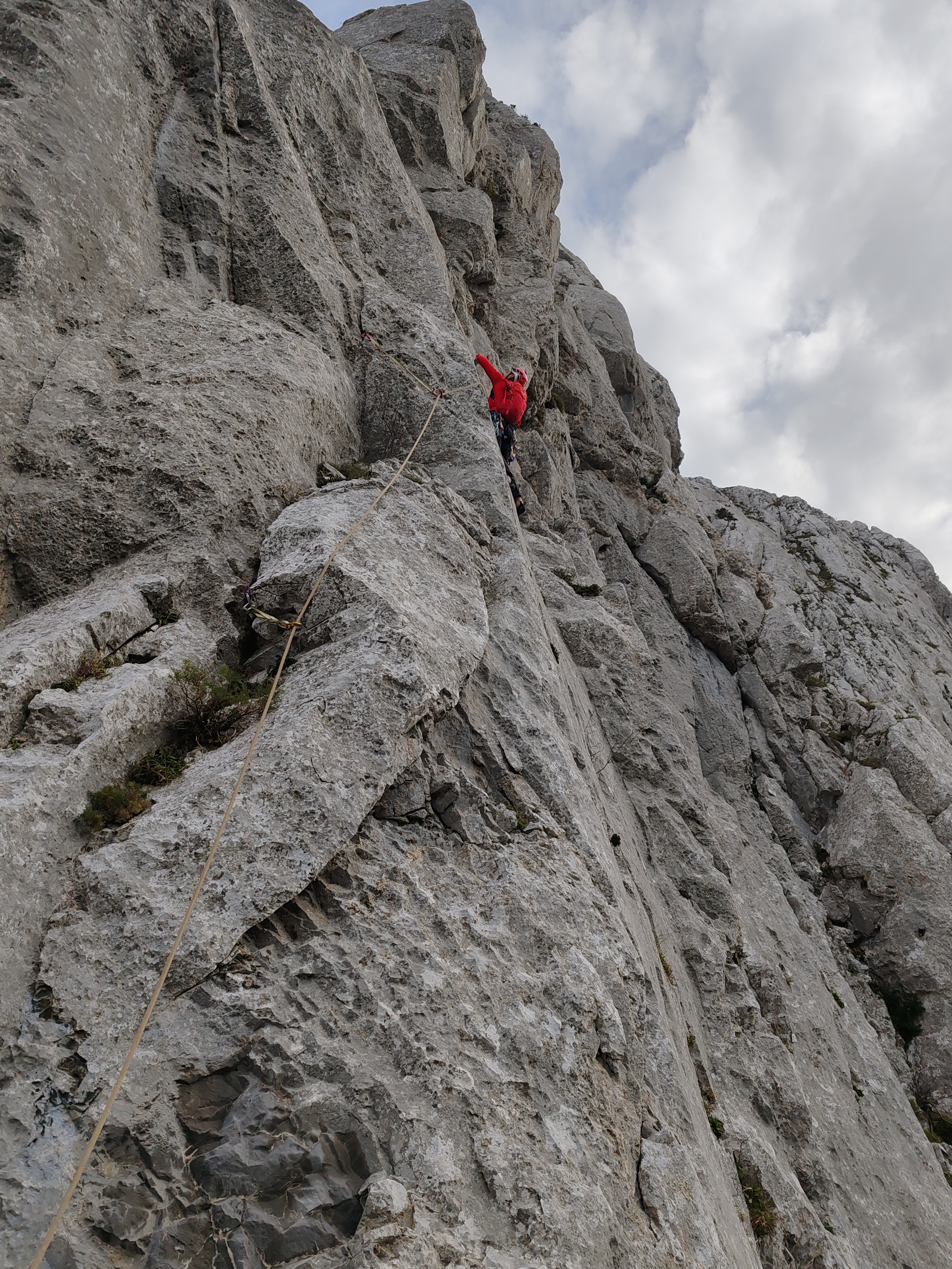 Largo 12 , 6a (60 metros): Largo muy bonito también. Trepamos hasta un clavo, después un paso sobre un gran bloque inestable para subirnos a una bañera de caliza donde encontramos 1 parabolt. De ahí salimos a la derecha (muy bonito) y seguimos por la arista entre grandes bloques a tope de cuerda hasta montar reunión al gusto sobre algún bloque.