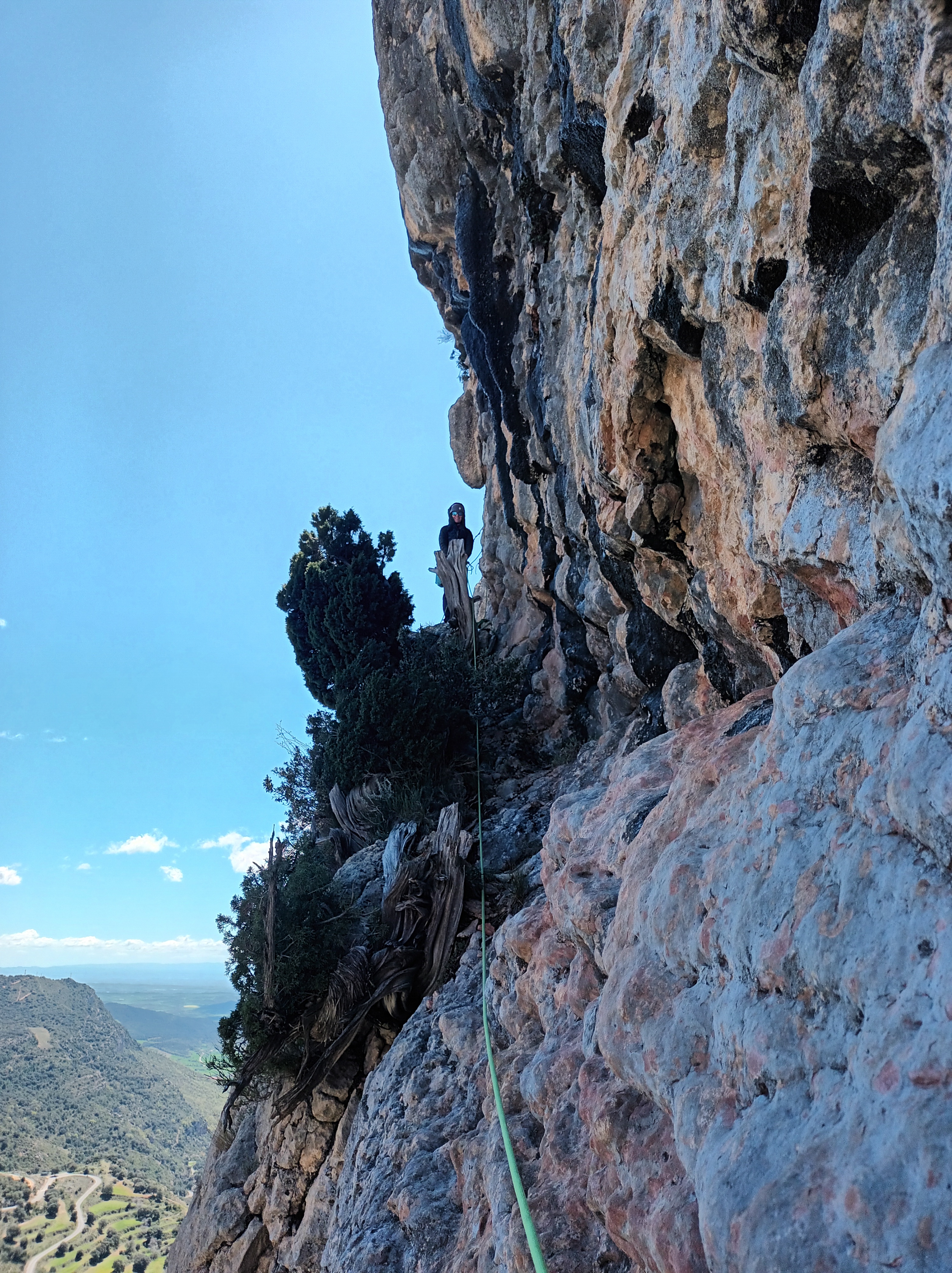 Largo 4 , V+ (25 metros): Salimos en recto, unos pasos de placa más apretados pero bien asegurados (6a). Después ya por terreno fácil hasta la reunión.