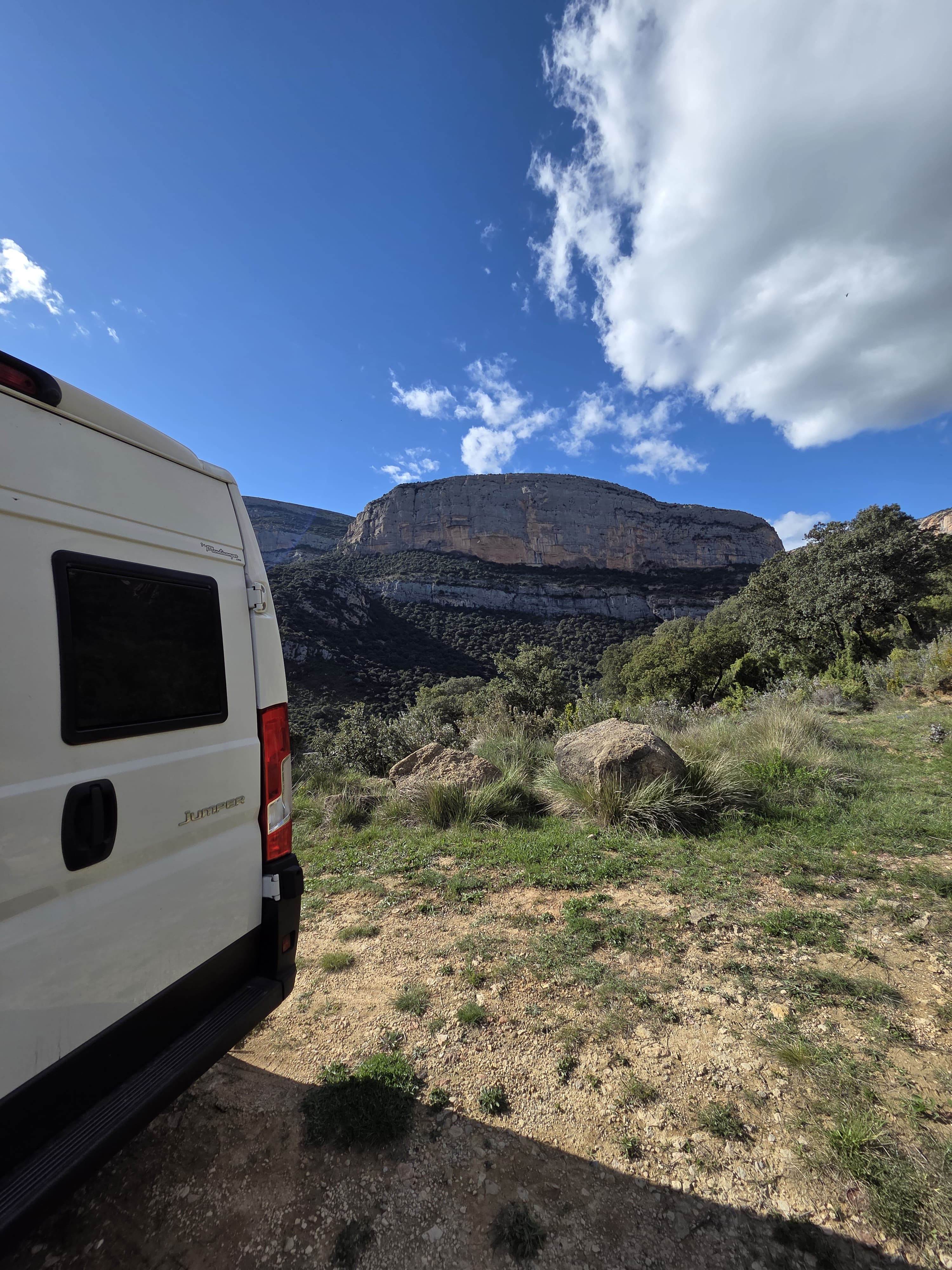 Aproximación: Pasando el pueblo de Vilanova de Meiá la carretera serpentea hasta situarse debajo de la gran pared Roc des Arcs (enlace a Google Maps), al final de la carretera cuando ya casi se acaba la pared se encuentra nuestra vía. Allí podremos aparcar teniendo cuidado de que el coche no sobresalga de la raya pintada en la carretera.