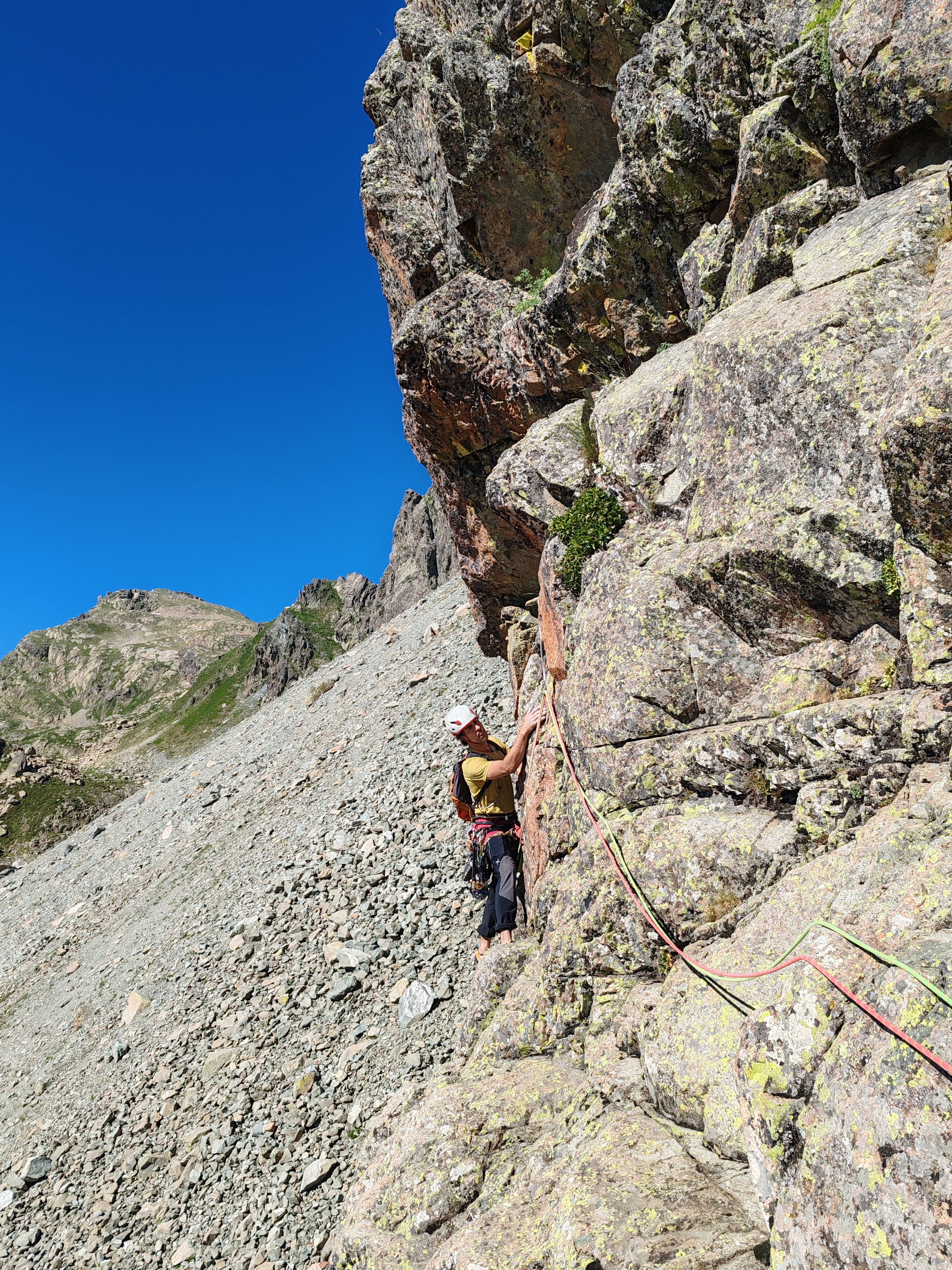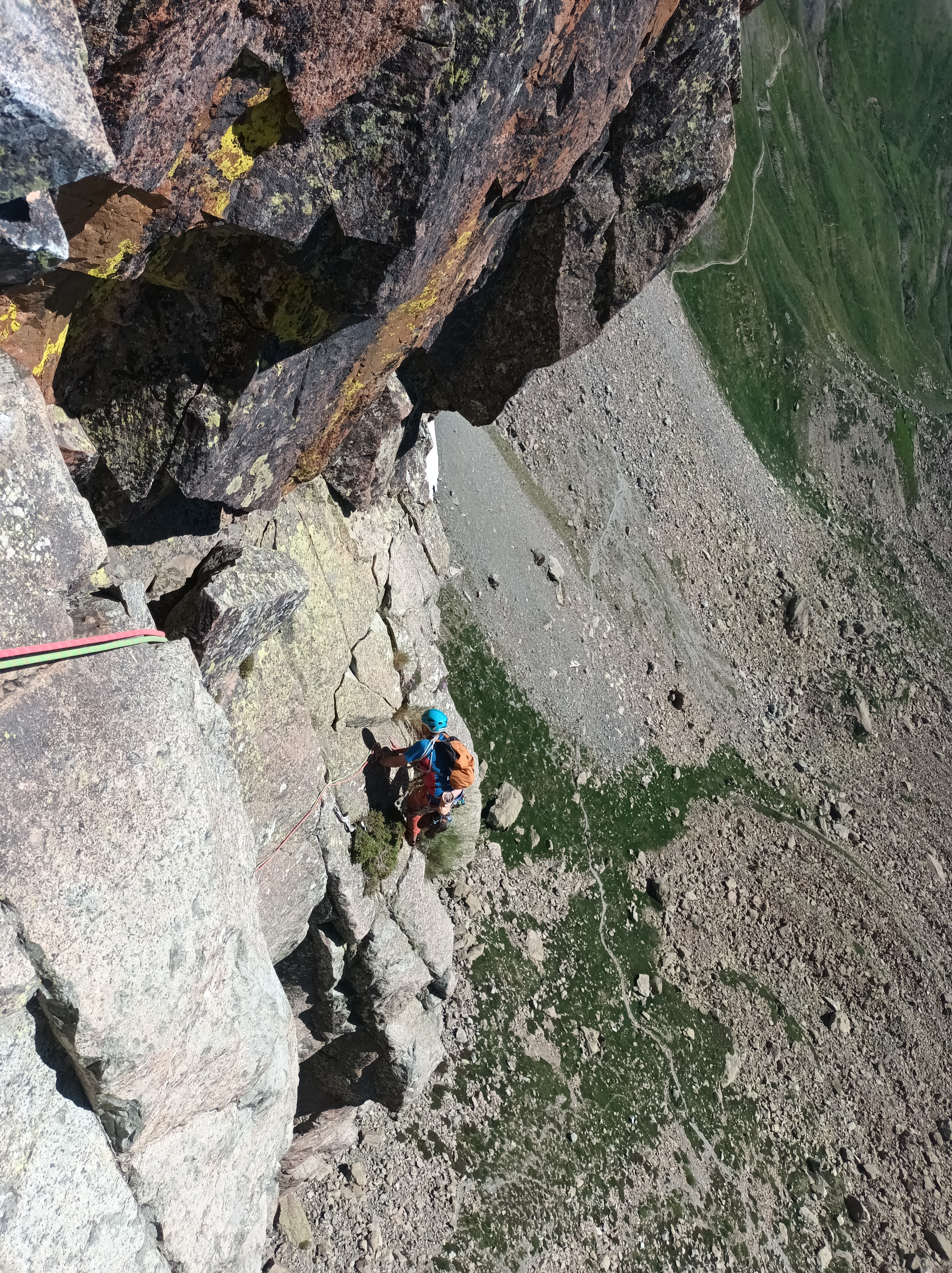Largo 4, V+ (30 metros): Salimos en recto por una placa con pequeñas baldas. Dejamos un desplome a nuestra izquierda y visualizamos una placa tumbada. Debemos incorporarnos a esa placa (es un pasito un poco expo pero se puede meter un Totem azul arriba para protegerlo).
