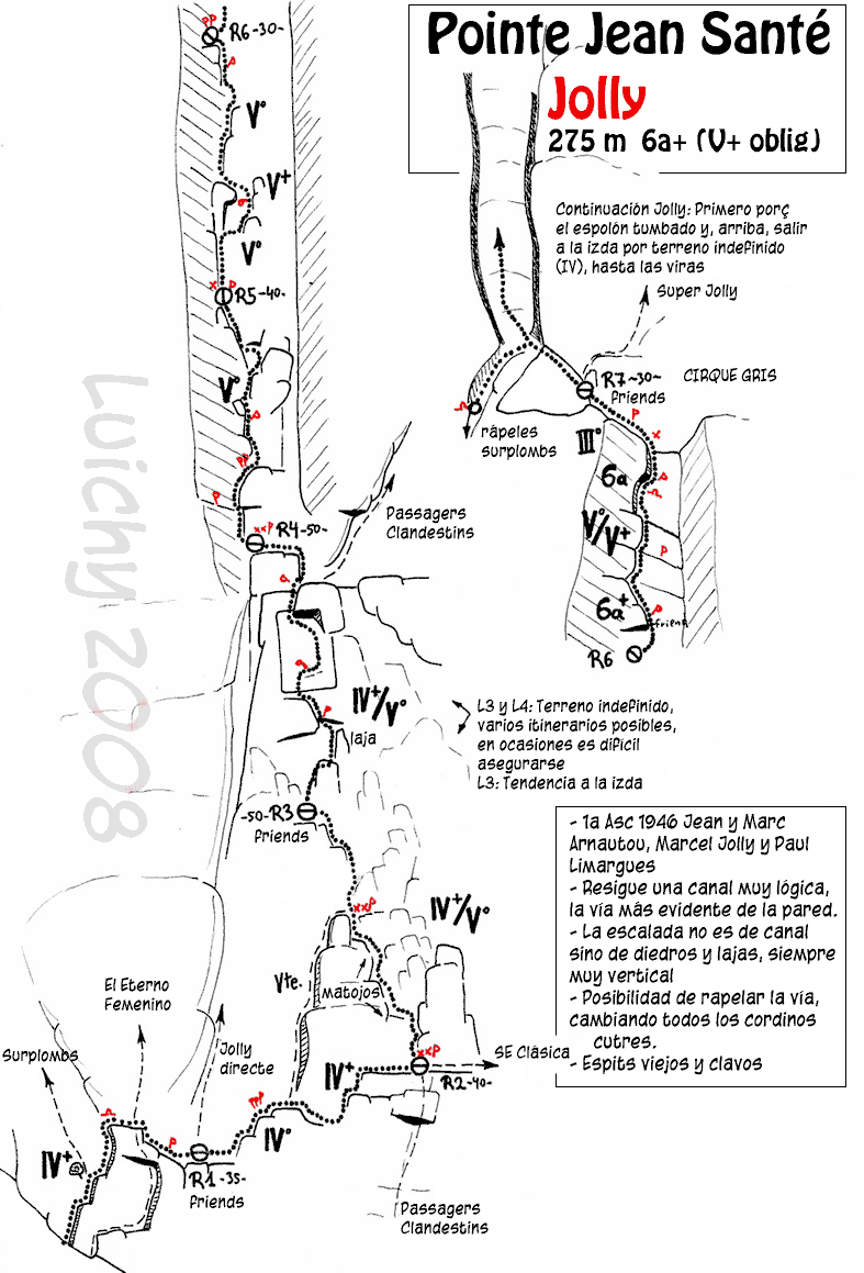 Los 2 primeros largos son comunes con la «Sudeste clásica», el tercer largo por terreno indefinido hacia la izquierda para alcanzar la gran canal. El resto de largos por la marcada canal.