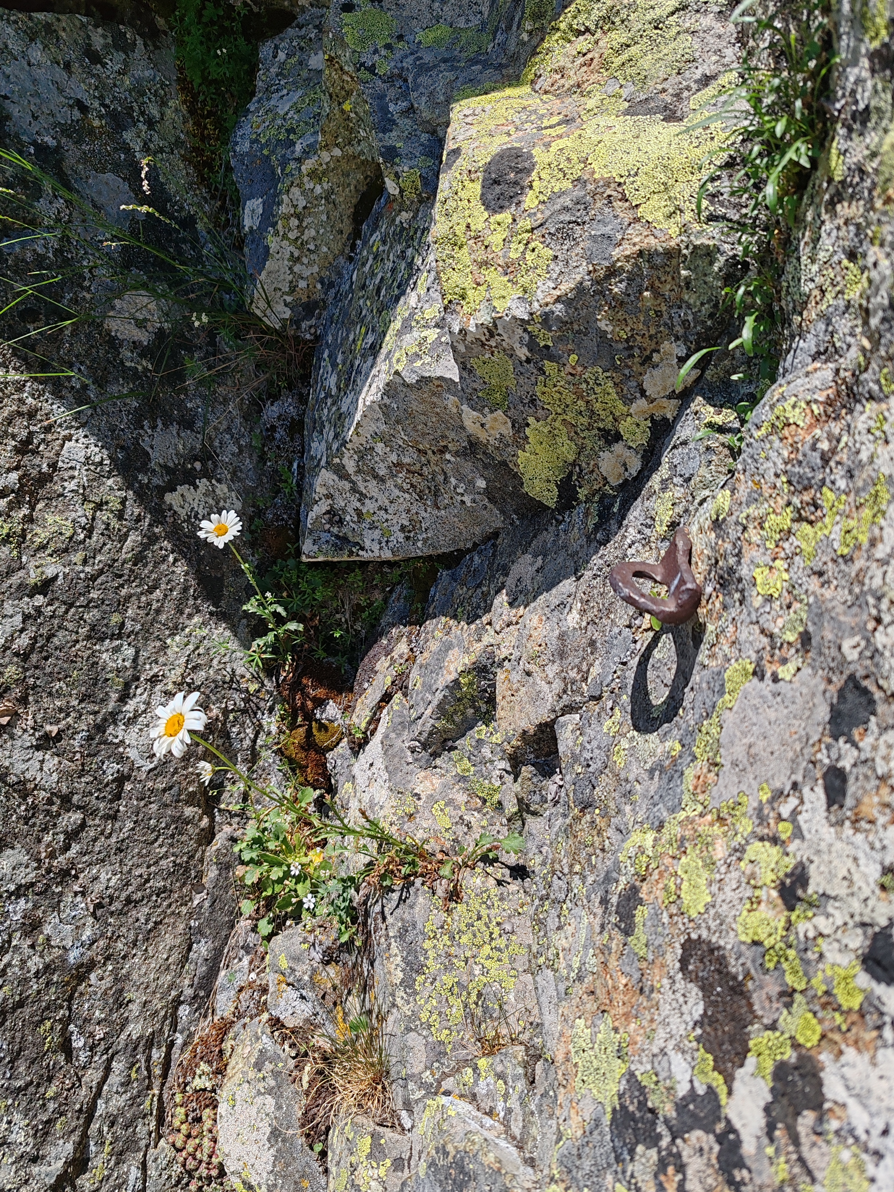 Después debemos superar por su izquierda el pequeño desplome de color amarillo, y salimos a otra placa tumbada que nos deposita en un diedro roto (con un clavo en el suelo, al pie del diedro).