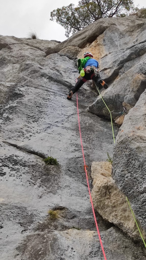 La reunión son dos parabolt con argollas para rapelar, y tiene una pequeña repisa donde dos personas están cómodas.
