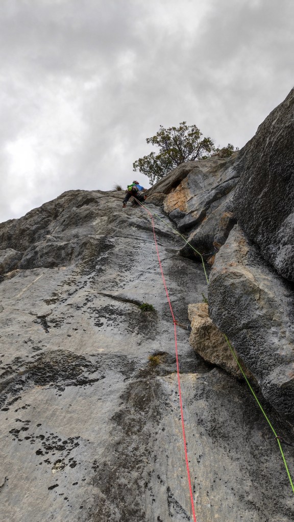 Largo 1, 6b (30 metros): El primer largo comienza en una pequeña laja que remonta a un plano tumbado donde para salir tenemos que superar un desplomillo con un paso fino de 6b sobre gotas de agua, pero muy bien protegido con dos parabolts. Una vez superado, una placa de gotas de agua con 2 bolts nos lleva a una bavaresa.
