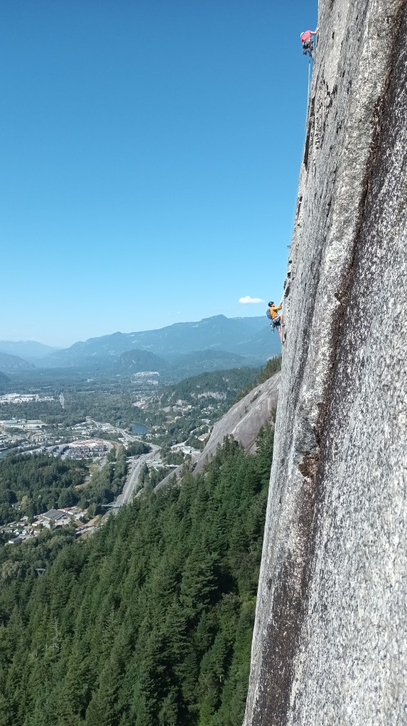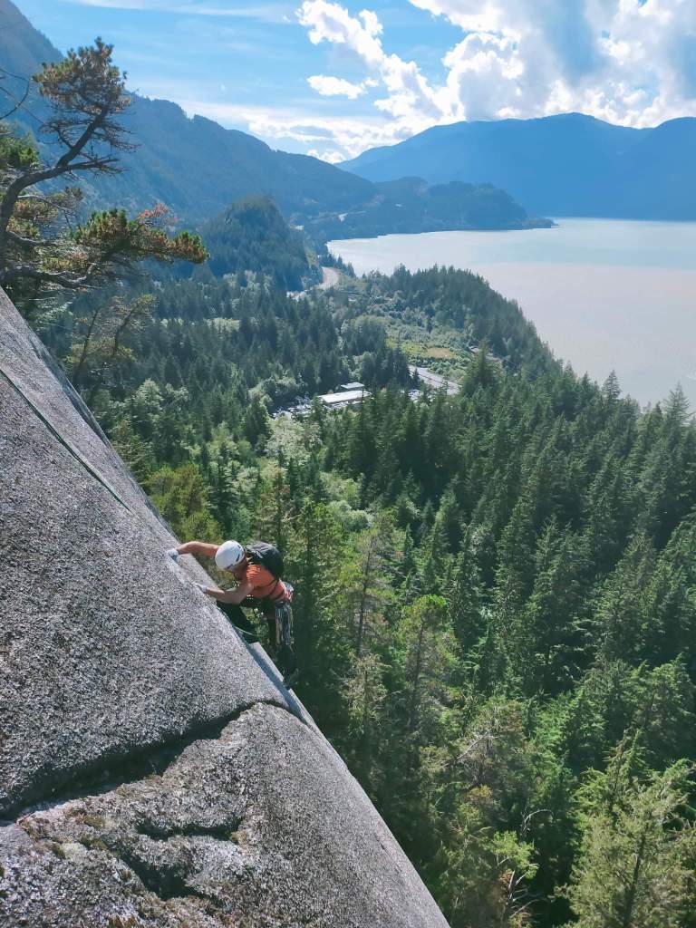 Esta escalada de fama mundial con gran patio es un «obligado» para aquellos con la experiencia suficiente. Paños de roca limpios de perfeto granito quedarán bajo tus pies mientras asciendes por las fisuras finales hacia la cumbre. Lo tiene todo: buena roca, fisuras perfectas, slabs con alejes, invertidos agotadores, placas delicadas…. y una de las mejores vistas de Squamish.